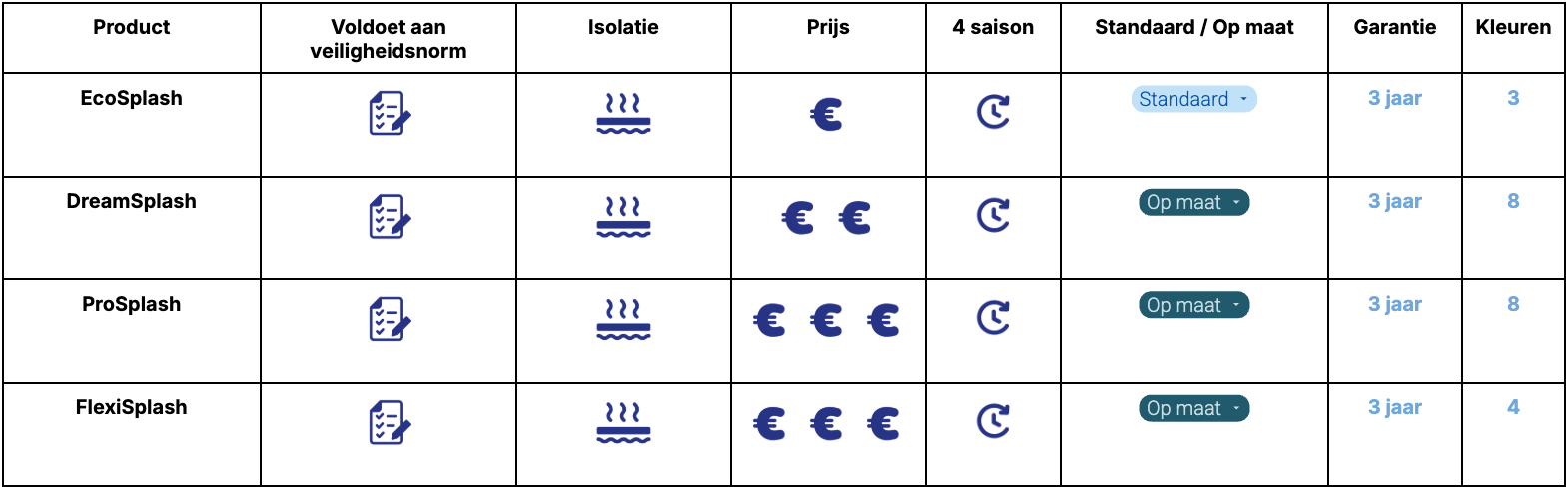 - Op maat gemaakt: FlexiSplash kan op maat gemaakt worden voor jouw zwembad en kan elk type zwembad en elke vorm bedekken;